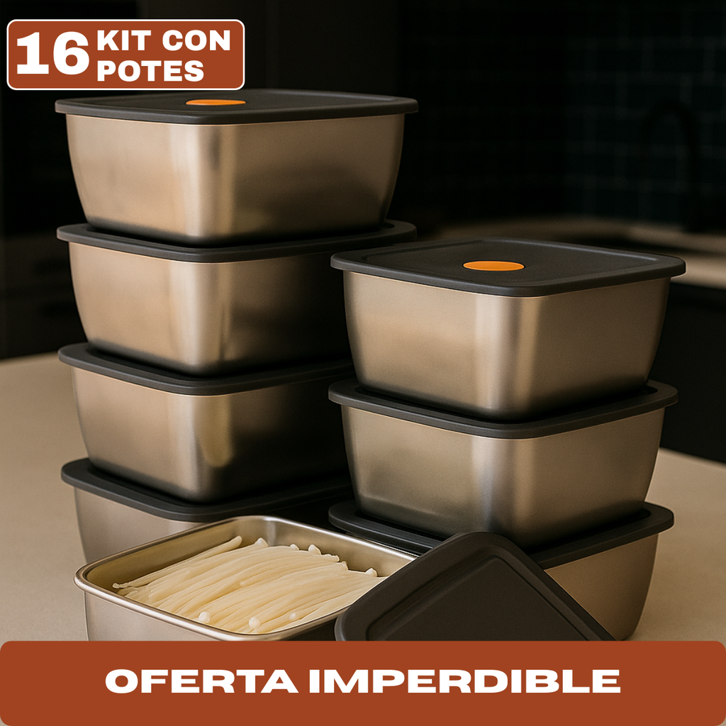 El Kit de 16 Recipientes de Acero Inoxidable Línea Premium está pensado para mujeres que disfrutan de tener todo en su lugar, con estilo y buen gusto. Su brillo pulido y su diseño moderno le dan un toque sofisticado a cualquier cocina, mientras que su practicidad hace que cada preparación sea más simple y placentera. Un conjunto que combina belleza, orden y durabilidad.